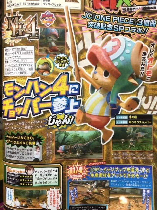 – Monster Hunter 4, il nuovo gioco di Capcom che sta facendo parecchio successo in Giappone… sta per ricevere una nuovissima novità. Dopo Link come cacciatore, e i vestiti dei fratelli Mario disponibili per i gattini… ora sta per aggiungersi Chopper, la renna della ciurma di Cappello di Paglia. Assolverà la funzione di assistente, sarà munito di un bastone come arma e ci terrà tanta compagnia durante le battaglie!