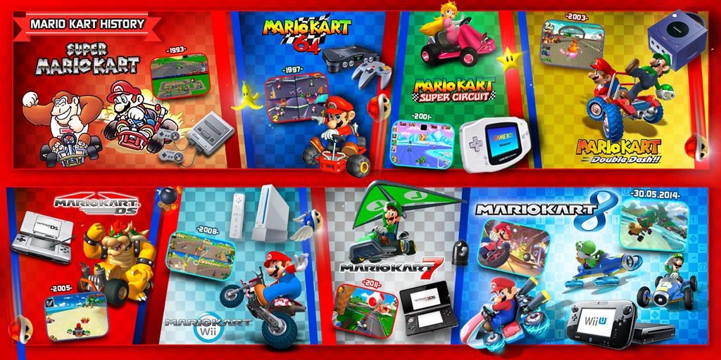 La serie di Mario Kart esiste da più di due decenni, il primo fu Super Mario Kart, che fece il suo debutto nel 1992 sul Super Nintendo. Fino ad oggi, sono stati creati ben sette titoli principali della serie, quattro su console casalinghe e tre su portatili. Il lancio dell’ottavo titolo, Mario Kart 8, è previsto per il 30 maggio 2014 su Nintendo Wii U.