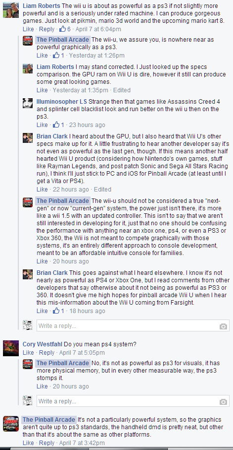 , gli sviluppatori dietro a The Pinball Arcade, hanno scritto su Facebook che anche la PlayStation 3 surclassa il Wii U per quanto riguarda la potenza e sostiene che il Wii U è un Wii 1.5. Questa affermazione è venuta fuori dopo che un fan di Nintendo ha chiesto se il Wii U è potente quanto una PlayStation 3.