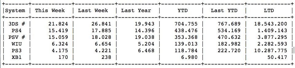 Al primo posto troviamo la famiglia 3DS con 21.824 unità vendute, circa 5 mila in meno della settimana precedente, seguono sul podio PlayStation 4 e PlayStation Vita con 15 mila unità ciascuna.
