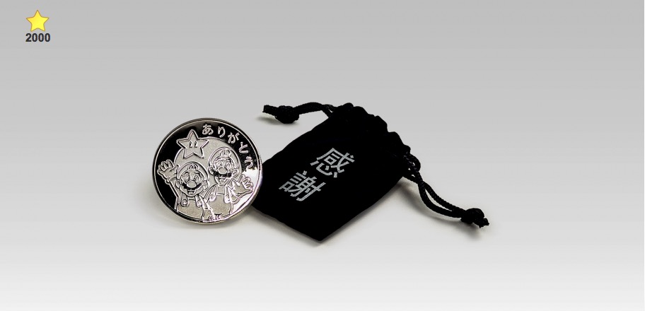 La moneta riproduce su un lato Mario e Luigi che in giapponese pronunciano un “grazie” mentre sull’altro il logo del club Nintendo. La moneta è placcata in color argento.
