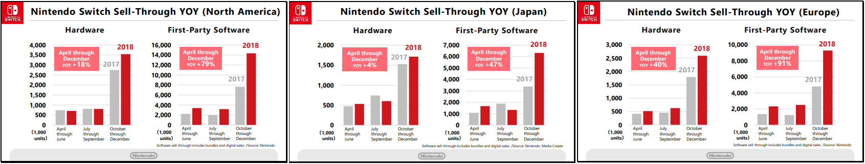 Insomma, un trimestre natalizio che fa registrare numero ottimi per la compagnia, ma che va a mettere in risalto il solito problema. Serve il software, altrimenti non si vende. Il ritmo di rilascio estremamente rallentato del 2018 ha portato ad una stabilizzazione della crescita per ben 6 mesi. Speriamo che per il 2019 Nintendo riesca a mantenere una cadenza di titoli più costante ed a limitare i port da Wii U.