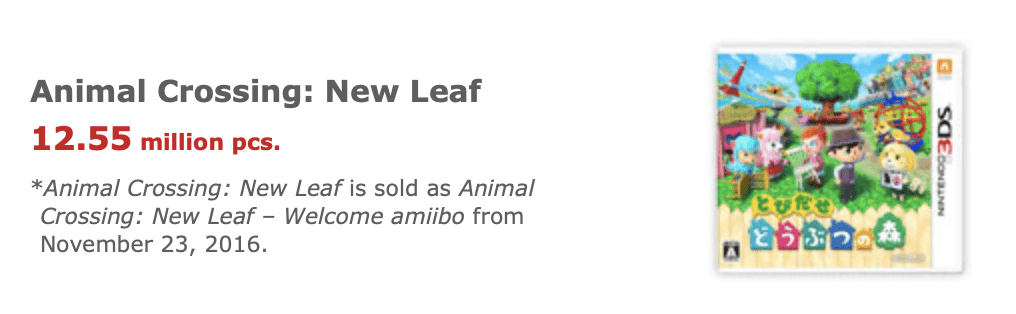 Il nuovo record è sancito anche dal confronto con il titolo precedente della saga, ovvero Animal Crossing New Leaf per Nintendo 3DS, il quale aveva raggiunto le 12.55 milioni di copie vendute dal giorno di lancio sino alla fine del ciclo vitale della console.