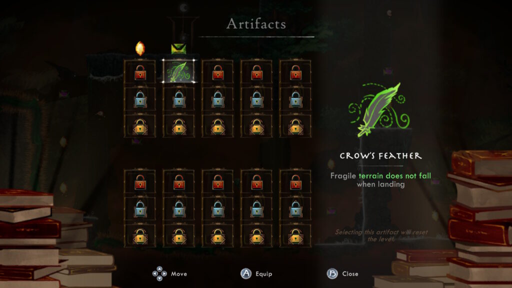 Le essenze sono delle ricompense che Evergate vi fornisce in tre casi. Il primo, come già detto, è il completamento del Gate in un determinato tempo, solitamente una trentina di secondi. Il secondo è l’utilizzo di tutti i cristalli presenti nel livello. Il terzo è il recupero di oggetti extra simili a delle fiammelle. Per ogni Libro, sarà possibile raccogliere le essenze che sbloccheranno fino a tre artefatti, dei perk attivabili durante la vostra avventura, che vi forniranno i bonus più svariati.