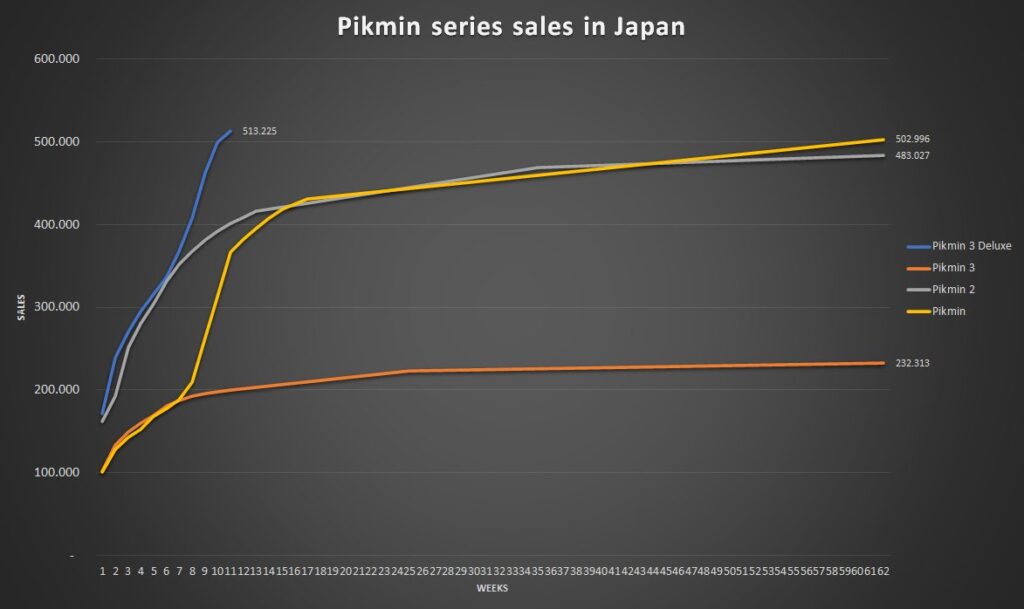 I dati digitali non sono inclusi in questa classifica. Di conseguenza, Pikmin 3 Deluxe è probabilmente intorno alle 600.000 o 700.000 copie vendute, includendo anche le digitali.