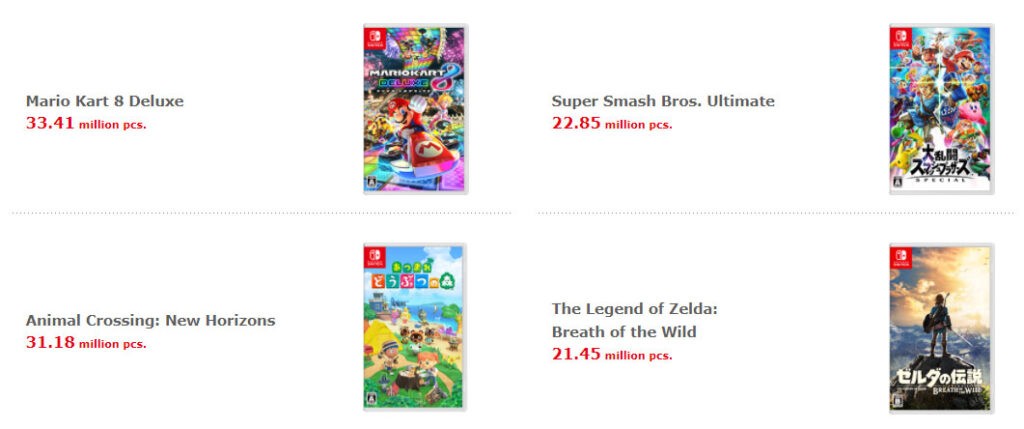 A primeggiare su tutti c’è l’ormai inarrestabile Mario Kart 8 Deluxe, titolo lanciato nell’aprile del 2017 e che al 31 dicembre 2020 ha raggiunto quota 33.41 milioni di copie vendute.