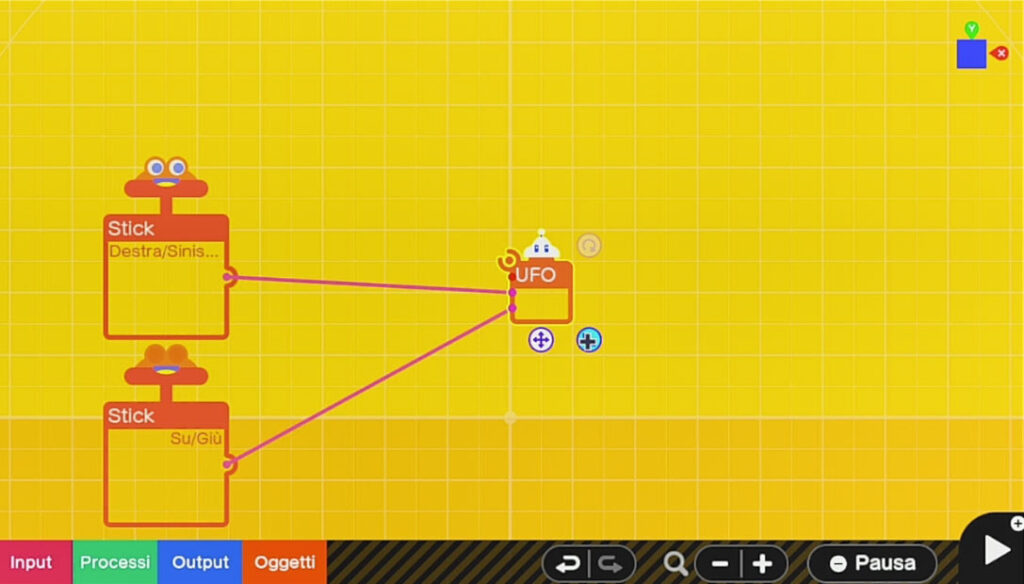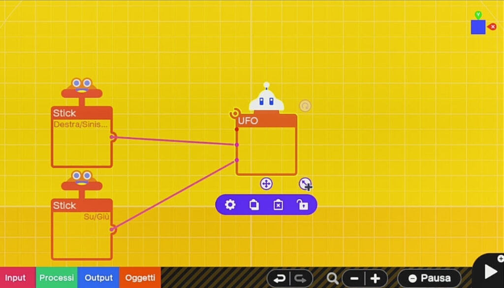 Abbiamo il nostro protagonista, ma forse conviene dargli un po’ più di “spazio”… da buon oggetto volante non identificato, è abituato a viaggiare tra le stelle! Permettiamogli di farlo associandogli correttamente i Nodon stick Su/Giù e Destra/Sinistra.