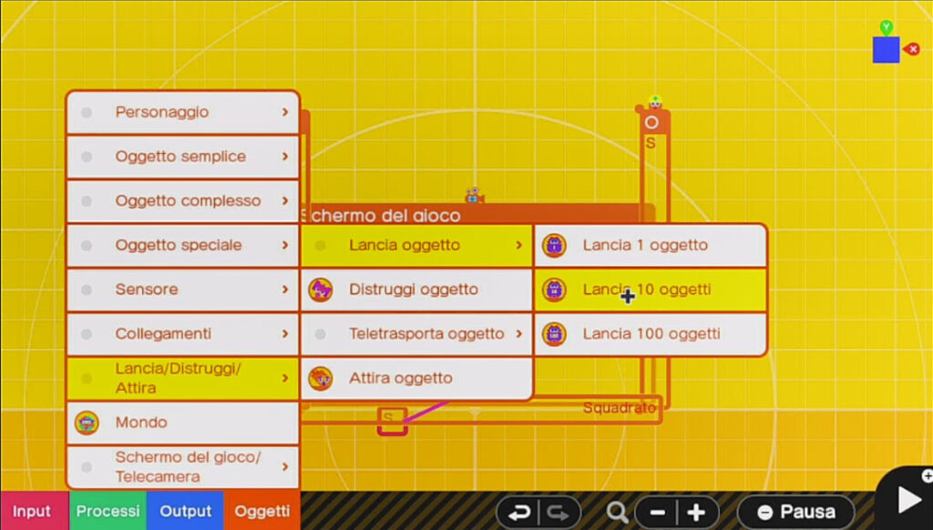 Possiamo quindi inserire un Nodon pulsante per metterlo al comando dell’azione stessa di lancio dei colpi. Farlo è molto semplice, basta metterlo prima del Nodon lancio oggetto, in modo che quest’ultimo riceva un avviso di “agire” solo quando noi premiamo il tasto scelto (in questo caso Y).