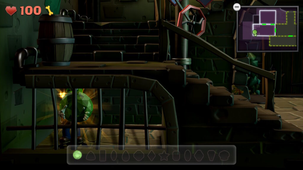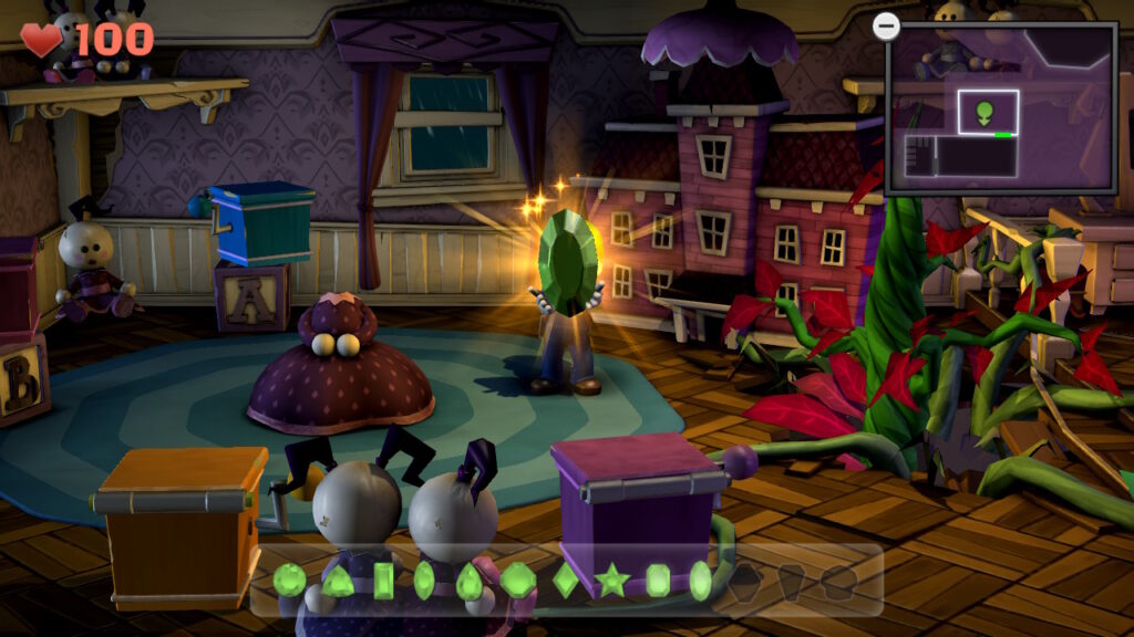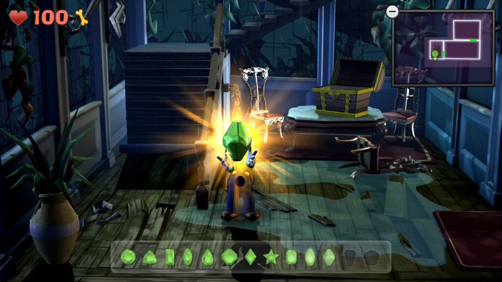 - Gemma #6 (atrio della torre, B-3): ci sono dei tubi nascosti all’estremità nord-ovest di questa stanza, su alcuni gradini. Rivelateli con il dispositivo a luce scura e poi usate il Poltergust per attivare la ruota idraulica. C’è anche una porta nelle vicinanze che dovrete rivelare con il dispositivo a luce scura: cercate il tappeto sul pavimento per capire dove si trova esattamente. Dopo aver fatto tutto questo, entrate nella porta e potrete usare una pianta di cactus per eliminare la trappola per mosche di Venere che protegge questa gemma.