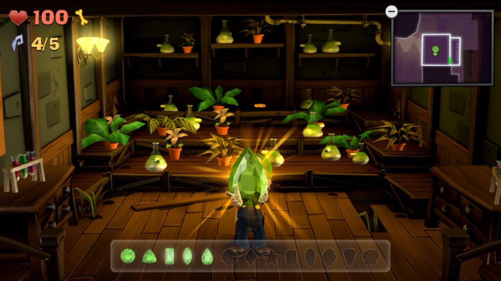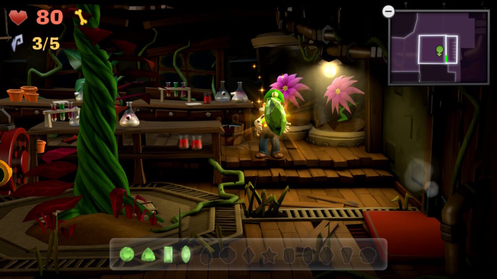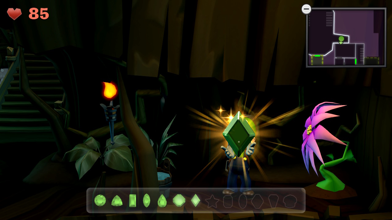 - Gemma #2 (Laboratorio, B-1): nella stanza con le piante a bolle, posizionate Luigi in modo che cada nel tubo gigante all’estremità ovest dell’area. Qui si trova un altro smeraldo intrappolato nelle ragnatele.
