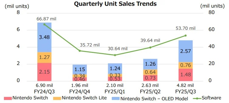 Nello scorso anno fiscale, Nintendo aveva venuto 6.9 milioni in quello che viene considerato il terzo quarto (Q3) dell’anno, un rallentamento che ha impattato la stagione delle “feste” anche per le vendite del software, che sono scese a 53.7 milioni di articoli venduti contro i 66.87 milioni del terzo quarto del 2023/24.