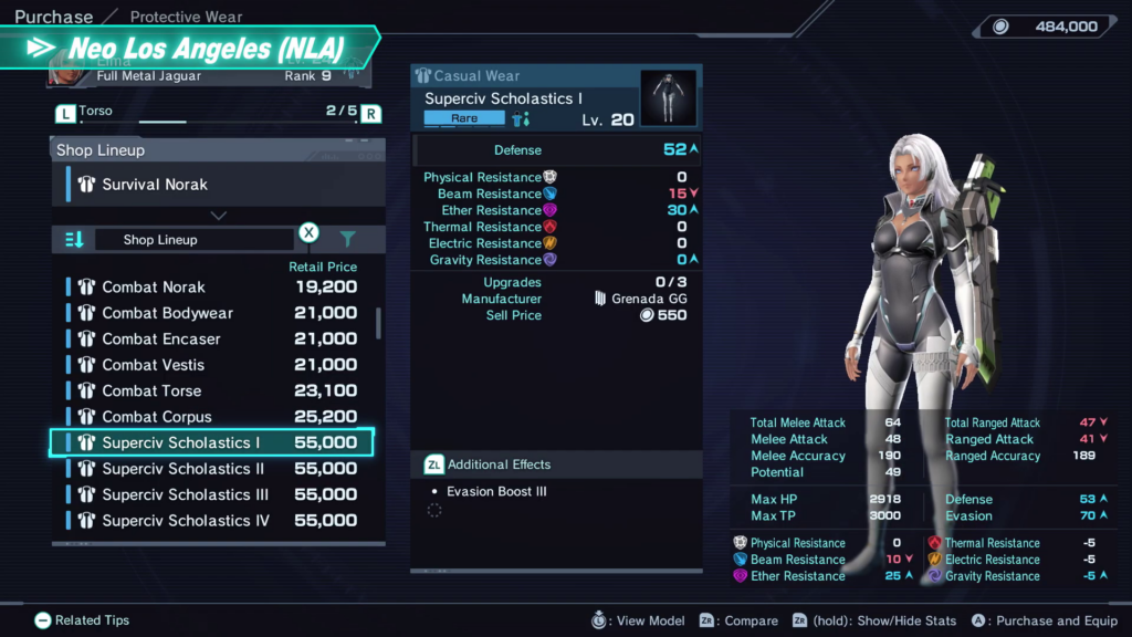 Il menu del negozio di equipaggiamento ci permette di scorgere su di Elma, sicuramente per volontà degli sviluppatori, l’armatura per il corpo “Superciv Scholastics”, di livello 20 e prodotta dalla Grenada GG. Di per sé non avrebbe nulla di speciale, con le sue resistenze al Raggio e all’Etere, non fosse che si tratta dello stesso abbigliamento di Neilnail, uno dei personaggi nuovi (o meglio, uno dei personaggi inseriti ora tra quelli all’epoca scartati). Torneremo su di lei tra poco.