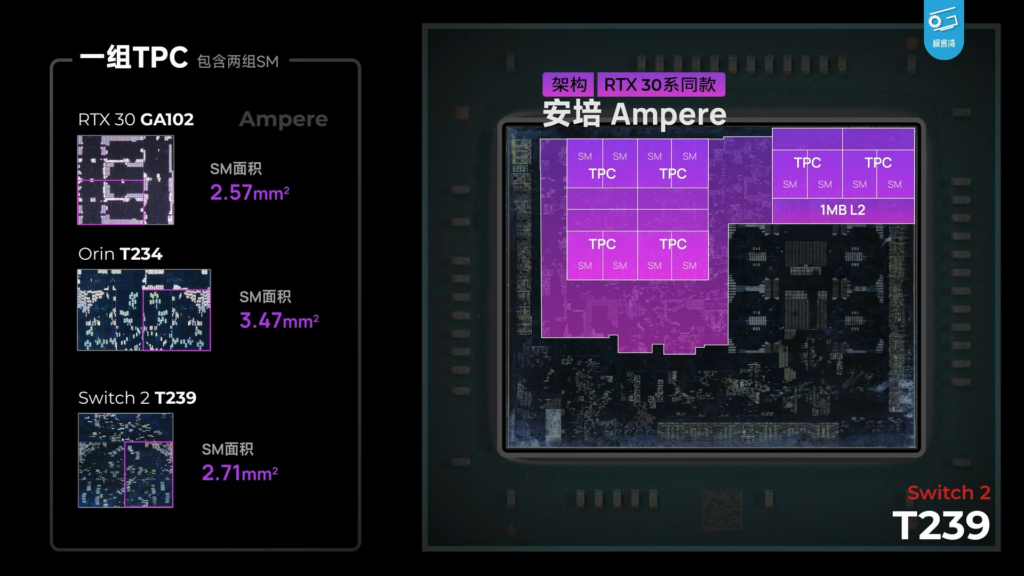 La GPU ha una disposizione di core un po’ particolare, storta se vedete nell’immagine. I core sono quelli di Nvidia Ampere, organizzati in 12SM, per un totale di 1536 unità di calcolo. Un aumento di 6 volte rispetto a Switch. La frequenza operativa in modalità undocked si assesta a 561Mhz, contro i 307Mhz precedenti, mentre in docked siamo a 1007Mhz contro i 768Mhz. Risultato è che abbiamo a disposizione un ordine di grandezza di potenza computazionale in più, di nuovo, simile allo Steam Deck di Valve.