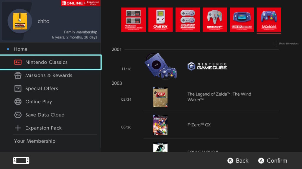 - la scheda Nintendo Classics ora include i giochi per Nintendo Gamecube