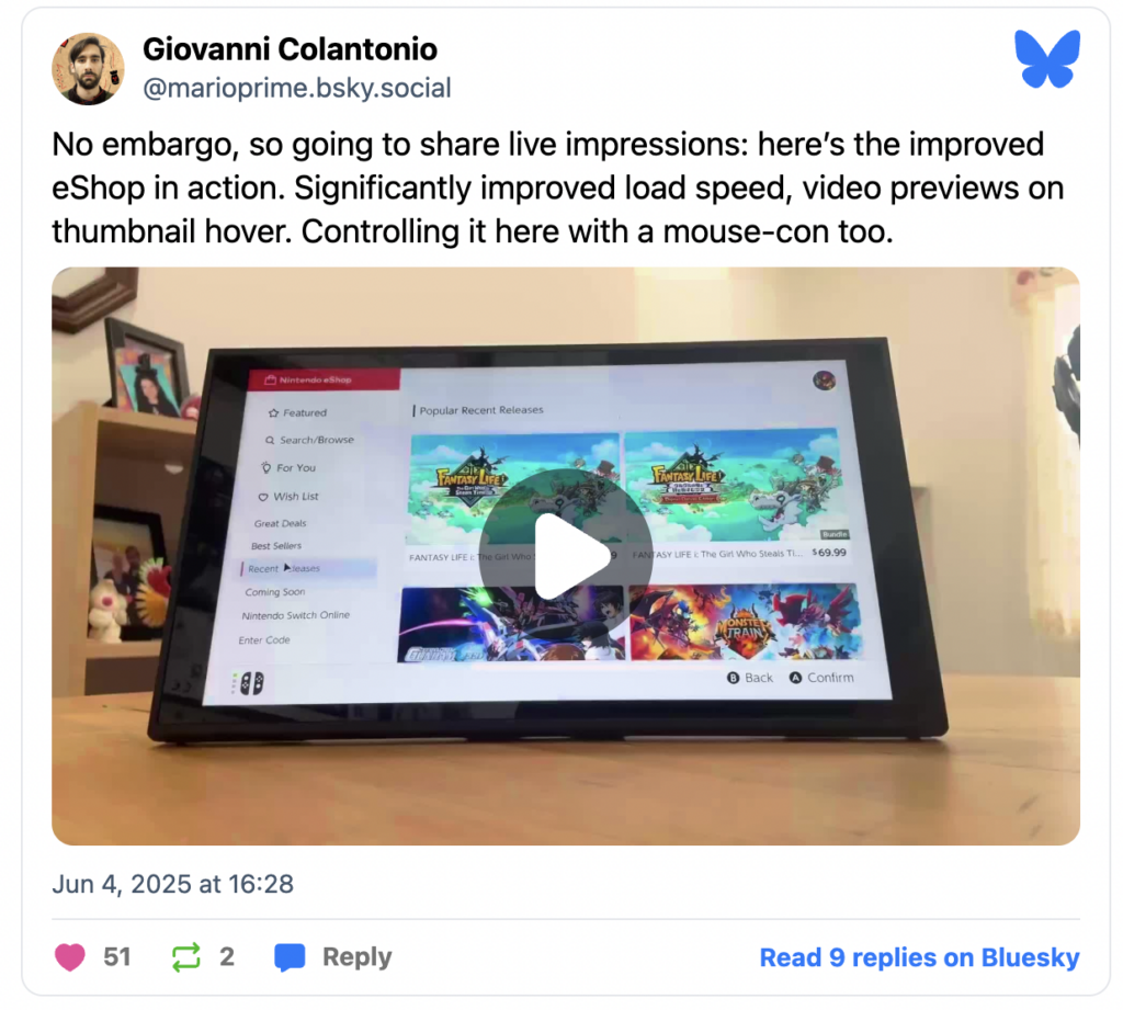 Ma, finalmente, tutto ciò ha trovato una conclusione rispettabile. A quanto pare l’eShop su Nintendo Switch 2 è decisamente più reattivo e prestante, permettendone una fruizione dei contenuti molto più fluida sia con i classici tasti dei Joycon 2, sia in modalità mouse. Anche il caricamento dell’anteprima del gioco tramite la semplice scheda della schermata principale dello store è nettamente più veloce.