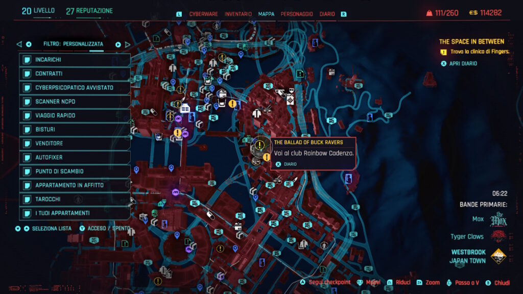 La stessa sensazione l’avremo appena aperta la mappa per la prima volta; vederla riempirsi di puntini, di icone che indicano le decine e decine di missioni disponibili e gli assalti pubblicati dalla polizia potrebbe spaesare non poco. A queste si aggiungono poi anche le missioni dei Fixer, i quali ci offriranno dei contratti per il recupero di personaggi o l’assassinio degli stessi, oppure missione di recupero di dati particolarmente importanti. Sempre a loro, poi, potremo rivolgerci anche per aumentare il nostro parco macchine virtuale, in modo da poter percorrere le strade di Night City senza dimenticarci mai dell’eleganza o della cattiveria necessaria per calcarne le vie.