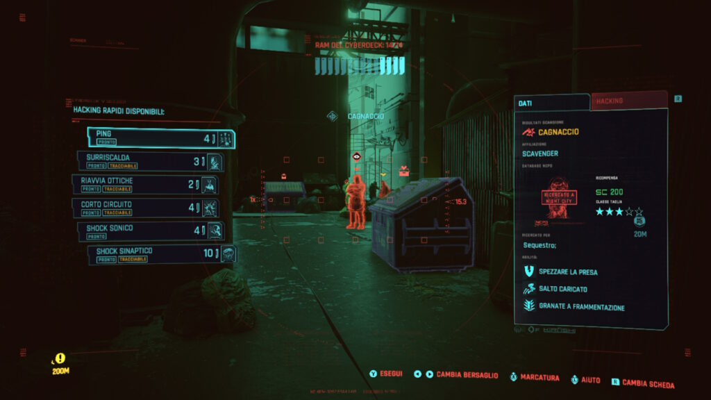 Sempre sfruttando le abilità date dalle modifiche cyberware e dagli hacking rapidi potremo poi infiltrarci nelle sottoreti di locali e attività attivando il protocollo di violazione dell’access point. Questo tipo di hacking ci metterà di fronte a un minigioco che, se completato con la corretta sequenza di numeri, ci garantirà ricompense sempre migliori.