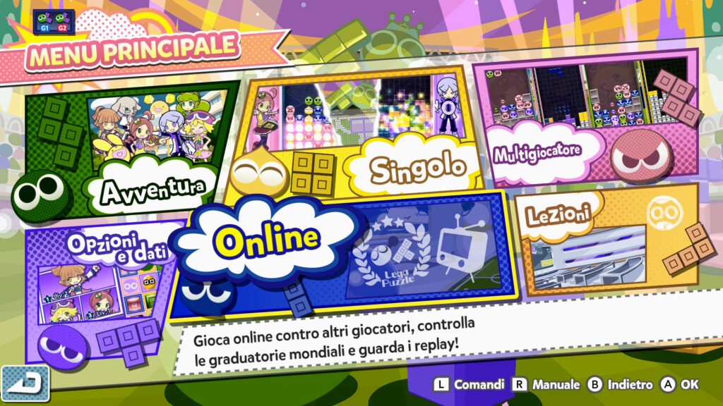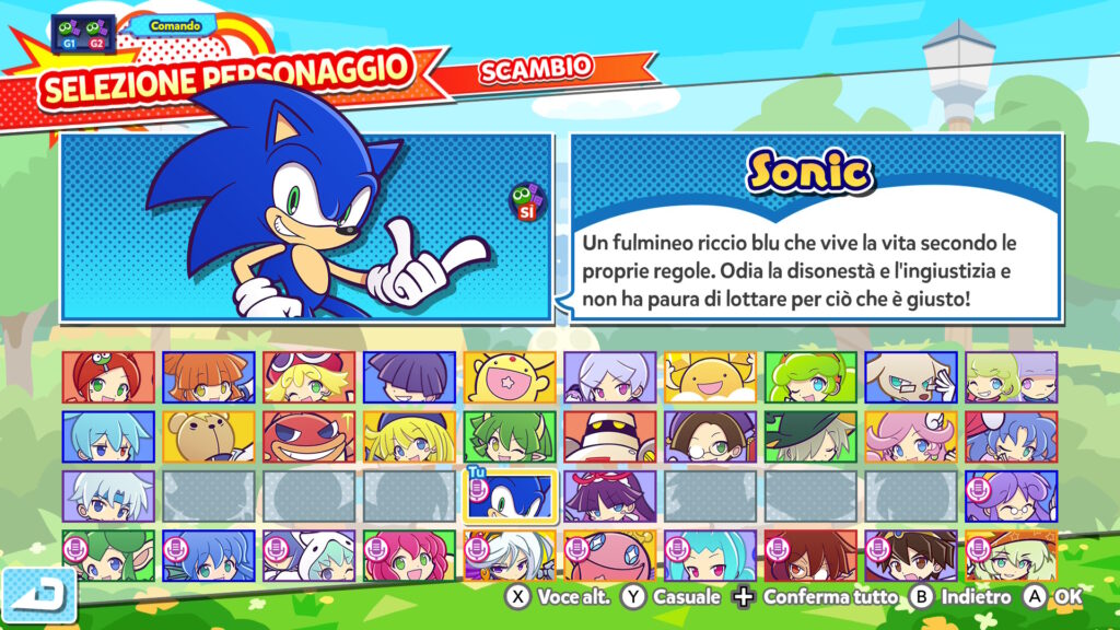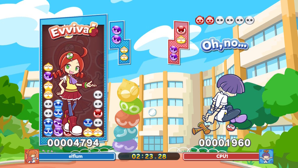 Cosa c’è di più rassicurante di Tetris in fin dei conti? Tantissimi sono cresciuti con il grande classico di Alexey Pajitnov, e lo apprezzano dai tempi remoti in cui era monocromatico, sobrio, istituzionale. Puyo Puyo di Kazunari Yonemitsu, al contrario, è sempre stato sgargiante, coloratissimo e con un’espressività mutuata dai manga. I due giochi hanno diverse cose in comune: si tratta di puzzle game in cui dei pezzi cadono dentro uno schema verticale, spariscono e fanno ottenere punti quando combinati efficacemente, man mano che si prosegue la sfida diventa sempre più ardua e prima o poi il game over arriva inesorabile.