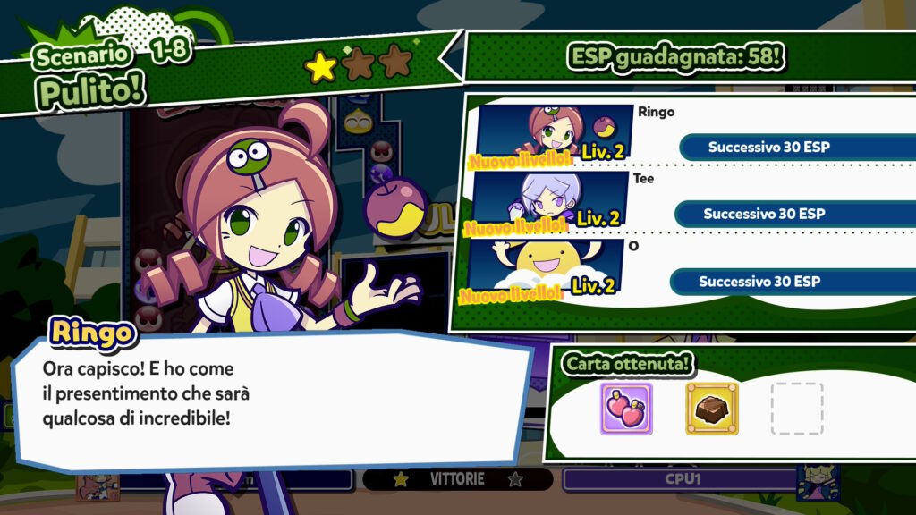 Puyo Tetris 2 è un gioco davvero generoso in contenuti. Nel menù principale è possibile destreggiarsi con Tetris o con Puyo Puyo in un classicissimo formato, oppure accedere direttamente al menù principale dove imparare i fondamenti delle regole nella sezione Lezioni. La modalità regina è Avventura, dove possiamo incontrare un variegatissimo cast di personaggi e tantissime storie strampalate. Nessuno sa bene perché alla minaccia mondiale della caduta di tetramini dal cielo debbano porre rimedio degli alieni e una brigata di alunni delle medie, ma se la trama è insensata, quantomeno i tantissimi livelli contenuti dipanano pressoché tutte le modalità del gioco. Ogni livello è introdotto e seguito da sequenze in stile Visual Novel tanto simpatiche quanto snervanti alla lunga, fortunatamente skippabili. Ogni livello ha tre stelle di giudizio, per una buona rigiocabilità, e i crediti guadagnati possono essere spesi in numerosi collezionabili.