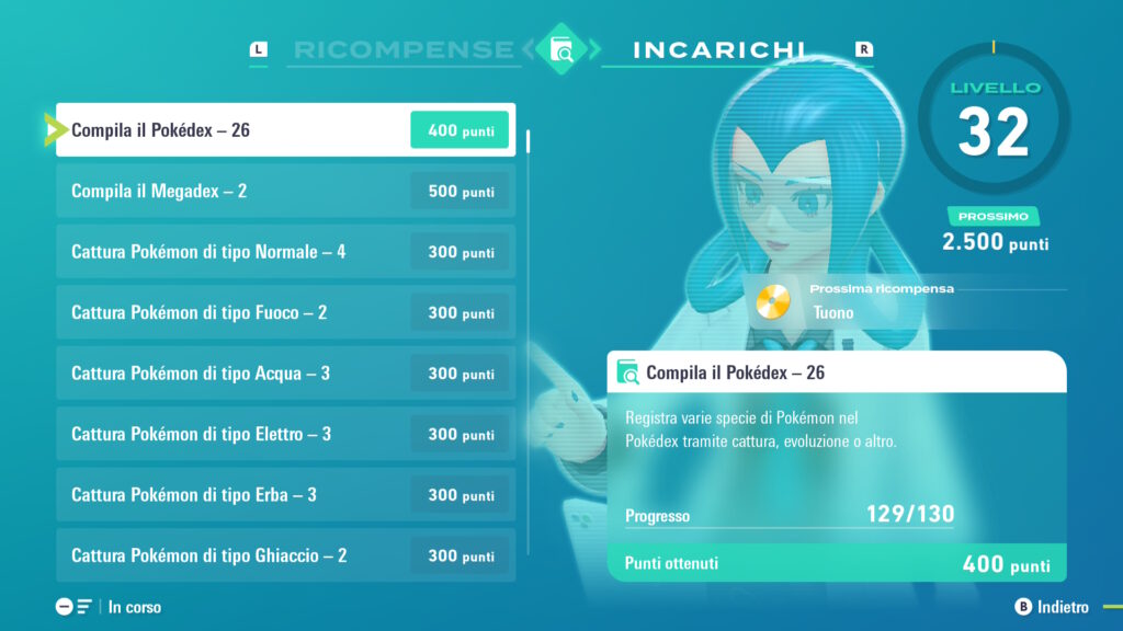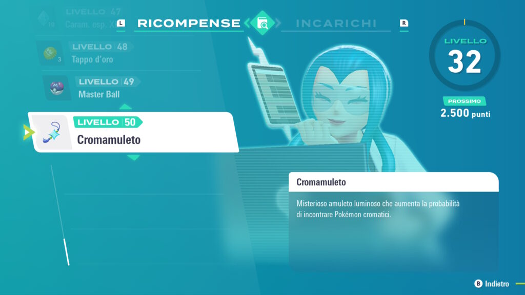 L’ottenimento del Cromamuleto si basa sullo svolgimento degli incarichi forniti da Martynia, accessibili ad inizio gioco dopo aver lasciato il laboratorio Pokémon di Luminopoli. Per raggiungere il livello 50 dovremo darci da fare e consultare la sezione “incarichi”, contenente tutte le attività disponibili ed utili per guadagnare punti. Tra le tante richieste, abbiamo elencato qui sotto alcuni esempi sugli obiettivi da compiere: